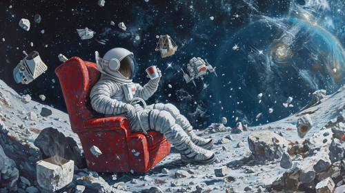 whimsical surrealism, an astronaut sits in a deck chair on the moon and holds a can of beer in his hand, the planet earth is reflected in his visor, holography style --ar 2:3 --v 6.1