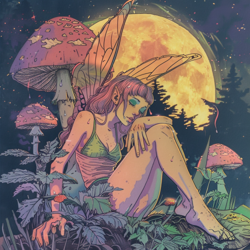 female weed fairy resting on top mushroom moon in background, 90's anime style