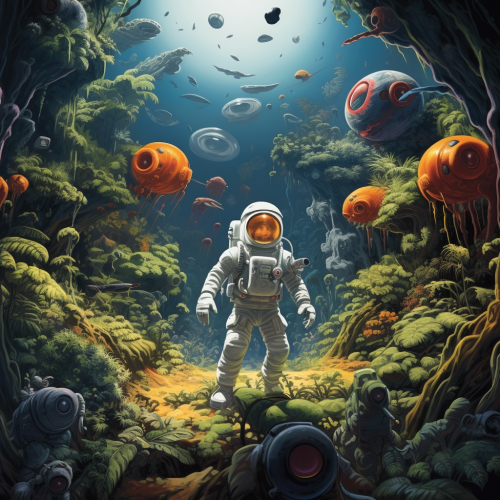 A highly detailed digital painting of an astronaut in a sleek, futuristic spacesuit meticulously setting up a luxurious event on a distant alien planet. The event space is illuminated with a soft glow from holographic tables and chairs, featuring elegant decorations in vibrant Green Elliott and Sunny Lime highlights. The astronaut is carefully arranging elements that float slightly above the ground, such as a holographic centerpiece and softly glowing event details. The background features a surreal alien landscape with towering, bioluminescent flora in muted shades, blending into a deep Konkikyō Blue (#132546) sky filled with countless stars and a mesmerizing Gloomy Purple nebula. Small, floating orbs of light drift through the scene, adding a magical atmosphere. The setting is both otherworldly and inviting, perfectly balancing the futuristic technology with the organic beauty of the environment. Created Using: digital painting techniques, sci-fi aesthetics, hyper-realistic textures, intricate lighting effects, cinematic color grading, soft yet vivid contrast, immersive depth --ar 16:9 --v 6.0