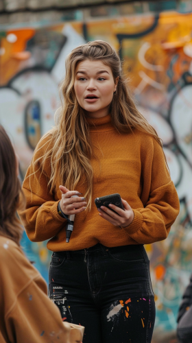 Photo of a 28 year old plus size young woman with long hair pulled back like model Gigi Hadid and a round face, the woman is wearing an ocher colored sweater and black pants with paint stains, the woman is giving a motivational talk to several people outdoors, detail in the hair and face of the woman who looks like model Gigi Hadid, too much realism HD --ar 9:16 --v 6.0