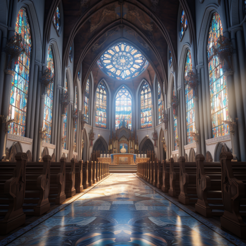 a cathedral with stained glass, blue ambient light, photorealistic, eye level perspective