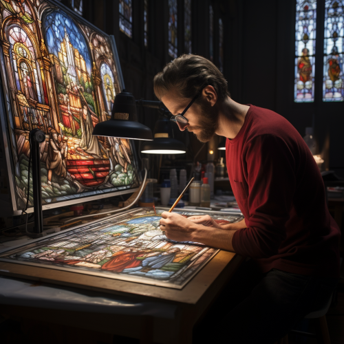 an artist restoring coloured stained glass windows from a church, hyperrealistic, lighting