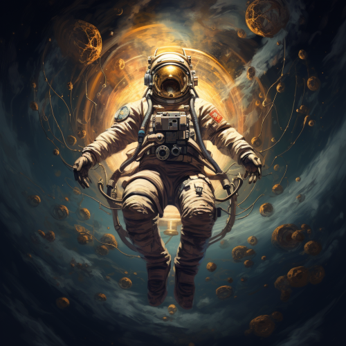 a row of people sit on golden thrones in space in golden spacesuits with luminous crowns --v 6.0