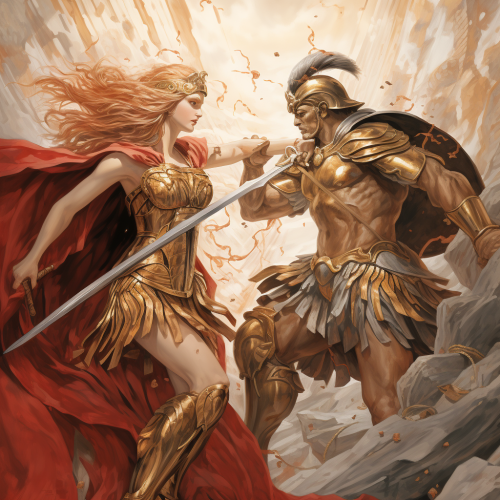Athena stands poised in an elegant, shadowy library, her dark robes draping gracefully over her figure, with a golden belt accentuating her waist. She holds her spear lightly, her eyes thoughtful yet captivating. The candlelight casts a warm glow on her face, highlighting her refined beauty and confidence cinematic, 4K --ar 16:9