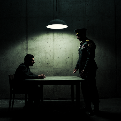 A dark, tense interrogation room in Iran, with a shadowy anonymous figure sitting at the table, illuminated by a single, dramatic overhead light. An IRGC officer in military uniform is standing aggressively, leaning over the table, shouting or talking forcefully at the seated figure. The officer’s face is intense but partially obscured by shadows. The room is stark, cold, and minimalist, with concrete walls. High contrast lighting, cinematic tension, and a moody atmosphere