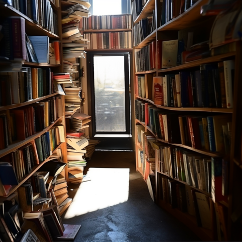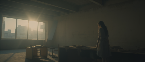 Cinematic photography, very wide shot of 幻想図書館, in 机に座って本を読んでいるメガネの美しい女の子, 2023's fashion, in the style of chiaroscuro, portraiture with emotion, backlighted, light-focused, defragmented, off-composition, cinematic, --ar 21:9 --style raw-gDI2ZmpkJ95dg