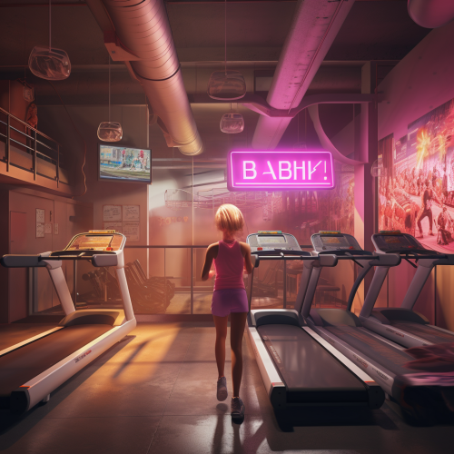 a realistic cinematic view of two people in the gyn. One doing pushups on the floor and the other running on the trademill. UHD rederized.