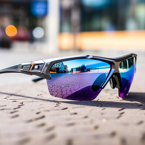 a hybrid pair of sunglasses, a mix between athletic running sunglasses and lifestyle sunglasses, product photo, mirrored lens