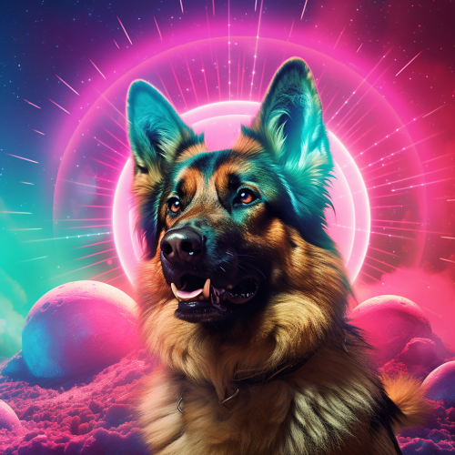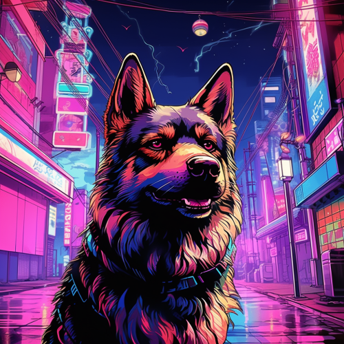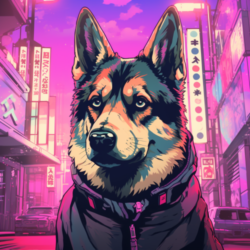 Japanese anime, vaporwave, animated German shepherd dog, streets of Tokyo