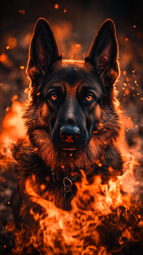 Chien Berger Allemand avec des pouvoirs de feu, son pelage est d'un noir profond avec des éclats de rouge et d'orange, comme des flammes. Ses yeux brillent d’une lueur ardente, et des flammes dansent autour de ses pattes et de sa queue. Le fond montre une scène de feu, avec des flammes et des braises illuminant le paysage. 8K, highly detailed, --ar 9:16
