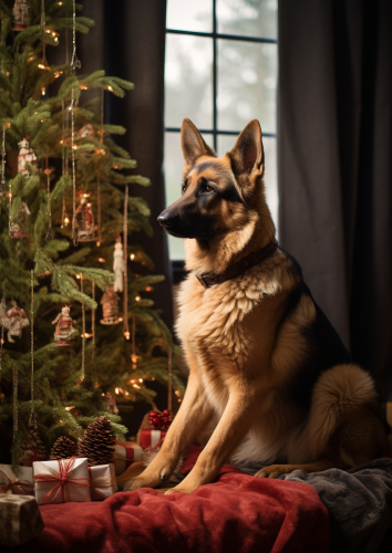 a hand made embroidered german shepherd sitting near christmas tree --ar 5:7