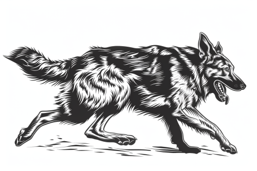 An athletic Straight Back Tan German Shepherd dog running nose down, in the style of a woodcut, full body, black and white, no background --ar 3:2 --v 6.0