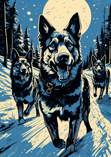 a poster of german shepherds running in winter wonderland in the style of neo-punk rebellion, blue and silver, layered gestures, carnivalcore, woodcut, full body, mcdonaldpunk --ar 5:7
