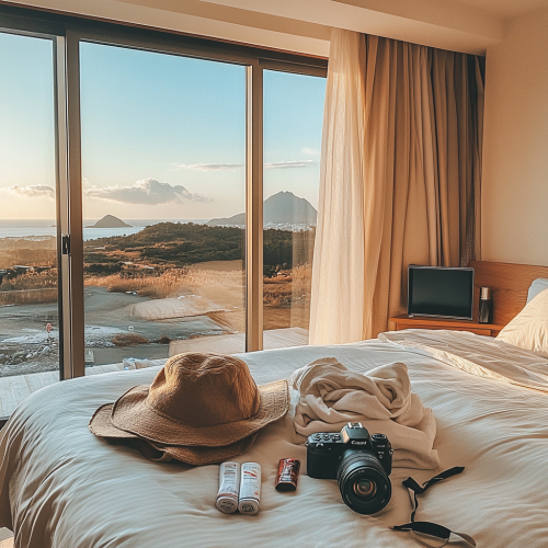 A cozy guest room scene with travel essentials neatly laid out on a bed: folded clothes, a camera, extra batteries, a hat, and comfortable shoes; the window view shows Jeju’s volcanic landscape in the background, warm tones, cozy lighting