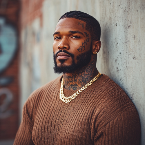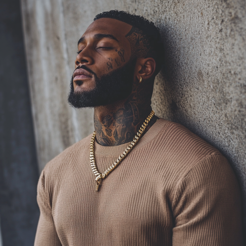 An athletic build BLACK MAN standing against a wall with RICH DARK SKIN. He has DETAILED tattoos on his neck ONLY, wearing a tan sweater with a gold Cuban chain. He has a beard and close-cut, silky hair. His edge up is sharp and perfect! Street guy, mafia vibe.