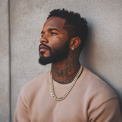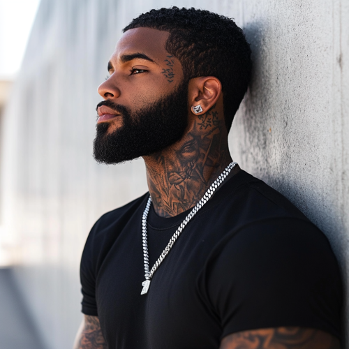 athletic build BLACK MAN standing against a wall. He has DETAILED tattoos on his neck ONLY, wearing all-black with a silver Cuban chain. He has a beard and close-cut, silky hair. His edge up is sharp and perfect! Street guy, mafia vibe.