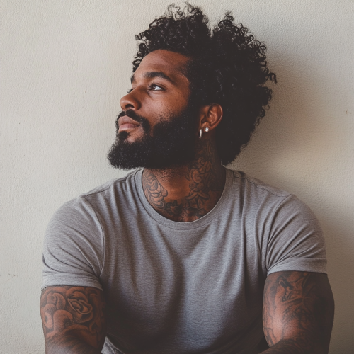 A A athletic build BLACK MAN seated with RICH DARK SKIN, slightly leaning his back against the wall. He has DETAILED tattoos on his neck ONLY, wearing a gray t-shirt. He has a beard and wild curly Afro. His edge up is sharp and perfect! Street guy, mafia vibe.