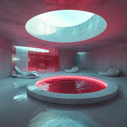 3D three quarter arial view of floorplan schematic view of futuristic round luxury spa room with circular pool in the center designed by JJames turrell neon red, soft stone texture, skylight circular above, hyper minimal, ultra minimal, autocad previs schematic of room technical drawing plan --v 6.0
