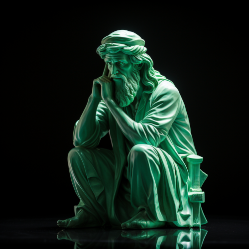 Statue of Leonardo da Vinci thinking with his hand on his cheek - in a sitting position - the statue is white with a bright green reflection - the background is black