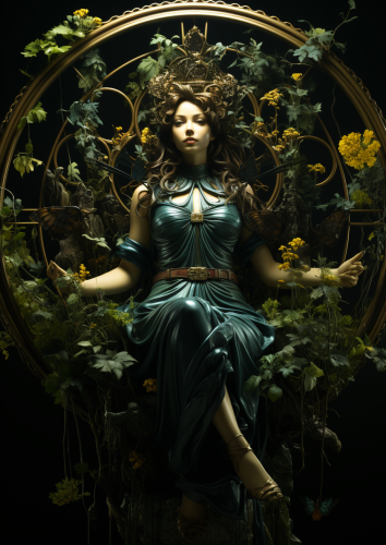 A zephyrous Divine Verdant god or godess image with Bucket, Isadora Duncan, a divinities styles, and a Symmetrical view --v 5.2 --c 15 --ar 5:7 --s 750