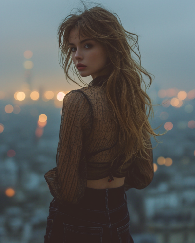 group x ray fashion feminine poses. Full body image, A hero shot photograph, wide, full body image, Hasselblad, A photo of attractive female hero girl on her quest, looking over the city of light, in the wind, a beam of light, on top, in the end of the world, brunette, loose top --ar 4:5 --style raw --stylize 690 --v 6.0