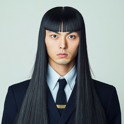 Full-body image of an evil-looking Japanese school boy, standing and facing forward. He wears a traditional Japanese school uniform with a dark blazer, white shirt, and tie. His expression is menacing with a sinister smile, and his eyes have an unsettling glare. His posture is slightly slouched, and his hands are at his sides or in his pockets. Dark shoes and neatly combed hair complete his appearance, set against a neutral background for focus on his figure.