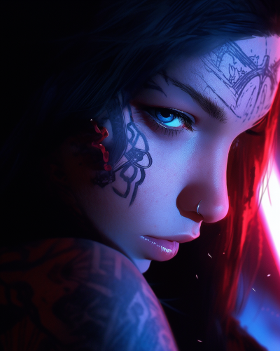 beauty assassin female fully tattoed serbian goddess, high angle photography, 16k uhd, epic details, realistic details, like real, neon kanji letter scotlight, real shadow, high contrast, uhd, high sharpness, super glowing detail --niji --s 70 --ar 4:5