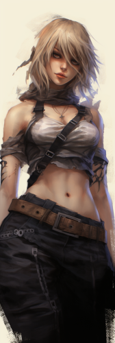A woman wearing a blue military uniform and hat who has an athletic build, dark shoulder lenght hair and keen green eyes. Her skin is tanned and she has a confident and almost mischievous smile.