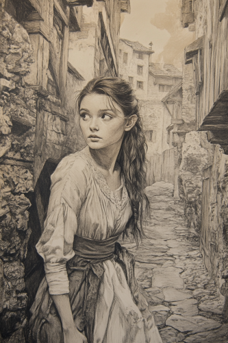 Fantasy art, portrait of Audrey Hepburn as a 15-year-old girl from Bree in Eriador, wearing simple artisan’s daughter clothing, with earthy tones and worn textures, set in the medieval streets of Bree with timber-framed houses, stone walls, and wooden structures, a sense of humble charm and mystery, her expression friendly yet enigmatic, during the golden hour with soft, diffused lighting, by Alan Lee. --ar 2:3 --v 6.1