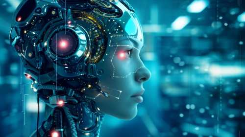 Generate an image illustrating a future where machines surpass human intelligence. --ar 16:9 --v 6.0 --no head
