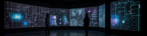 immersive exhibition with no people in a dark room borderless wall screens. There is no people around. Few HUD elements with bars with buttons and charts with hologram UI floating in the air and on video walls that defy the boundaries of reality, meditative room, epic scenery, huge walls of projections, motion design, sublte, dimlit lit, moody, Touch designer interactive art, design, 8k, hyperrealistic, studio, dynamic Cinematic, minimalitic atmosphere in Apple aesthetics. off-center, Wide angle prime lens --ar 4:1 --v 5.0 --upbeta