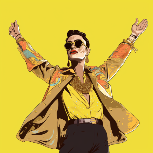 illustration of a Frida Khalo dressed as Fredy Mercury with her emblematic yellow jacket and her arm raised