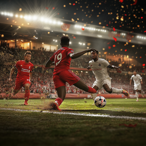 Create a highly detailed photograph capturing the moment immediately after a soccer player has evaded an opponent's pursuit and taken a shot at the goal. Focus on the player's expression of determination and intensity, with the ball in motion toward the goal. The background should include a dynamic stadium atmosphere with cheering fans, highlighting the excitement of the match.