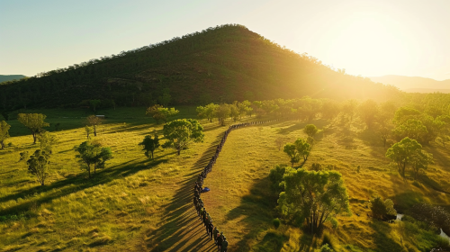 film still, australian landscape, people in a line leading up to a big beautiful mountain, sunny, green, wide shot, aerial --ar 16:9