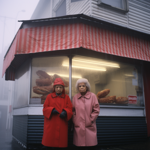 Retro photography, facade of a fried chicken shop on a street in London, year 2000, Grey skies, two old women are inside eating, wearing red, grainy, vhs