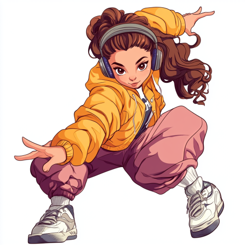 disney cartoon style, austrian girl is dressed as a hip hop dancer wearing headphones, in a breakdance pose, looking into the camera, white background