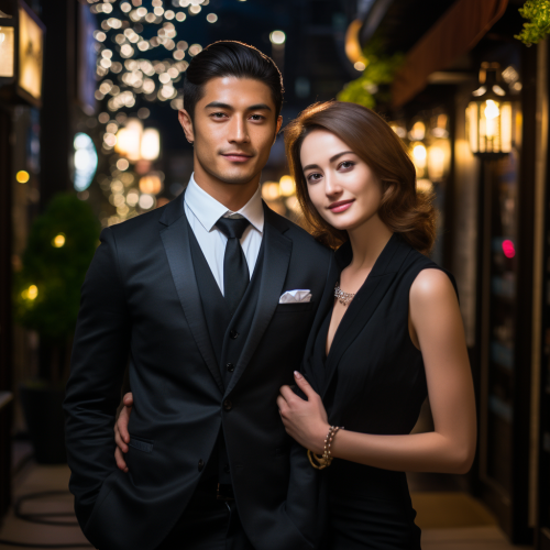 Man and woman, Japanese, 23yo, trained body, handsome, smiling, luxury brand suit, Tokyo at night, party at a restaurant, --v 5.2