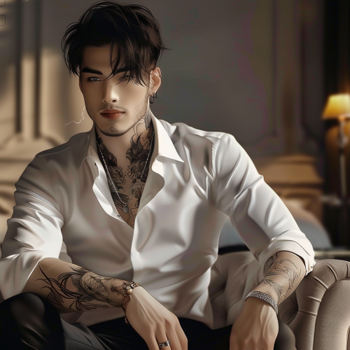 anime style Marketing managers, gay young handsome, romantic, White male executives, slim body, tatoo all over body and chest, anime style characters, a luxury room, --v 6.0
