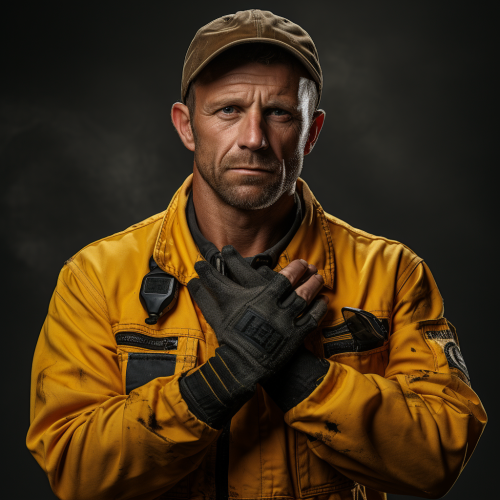 a mechanic poiting with his hands in front of himself, yellow shirt , grey dungarees, realistic photography, highresolution, high detail, neutral background --s 250