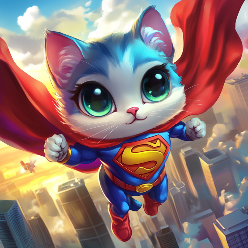 A cute chibi cat dressed as Superman, with a vibrant blue and red costume, complete with a flowing red cape and the iconic 'S' emblem on its chest. The cat has expressive, heroic eyes and a playful stance as if ready to leap into action. The background features a whimsical cityscape with skyscrapers and clouds, highlighting the cat’s superhero charm and adventurous spirit. 4K, HDR, highly detailed