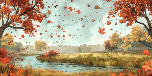 a simple and cute fall autumn design background for a fantasy style cozy game set during the fall, the scene is of falling leaves in a simple meadow with a river running through it, simple design --v 6.0 --ar 2:1