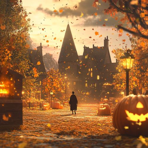 Generate a high-resolution, autumn-themed image set in the magical world of Harry Potter. Capture the charm of fall with pumpkin patches, warm golden hues, and colorful falling leaves in a scene filled with wizarding elements like broomsticks, floating candles, and spell books. A scene of Hagrids hut or a portion of the Hogwarts grounds can be shown. The atmosphere should be whimsical and magical, evoking a sense of warmth and adventure on a crisp fall day.