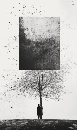 a mixture of rectilinear forms, photorealistic elements, and a distant human figure all combined to represent the season of autumn, black and white, --ar 3:5