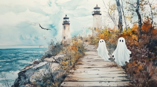 vintage watercolour painting, autumn season. lighthouse, wooden boardwalk dull colouring with some greenery and blue ocean. view is upclose. with two white halloween ghosts on wooden boardwalk --ar 16:9