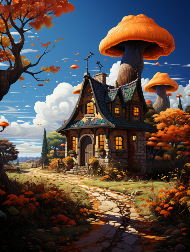 crazy fine art, little psyche, anime and cartoon art, little country house with big tree, autumn colors, and pumpkin fields, wide angle, bright colors, ultra detailed, realistic --ar 3:4 --s 640 --c 5