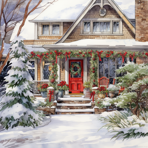 front porch garden, decorated for Christmas, done in a blend of natural history and botanical illustration styles, --ar 1:1