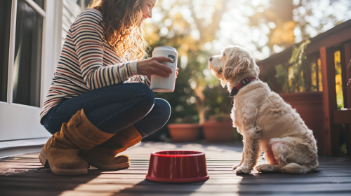 Opening shot of A woman in boots and a striped shirt kneeling down to interact with her dog while she holds a YETI mug on the front porch. There’s a red dog food bowl on porch floor. The outdoor scene shows a front door nearby on a sunny day with a bokeh effect. This image was captured using a Nikon D850 camera. --ar 16:9