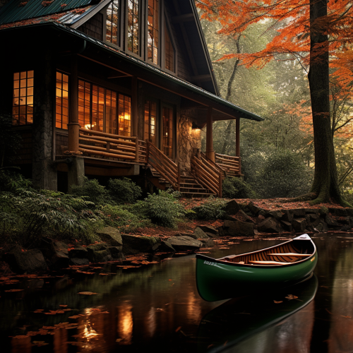 Professional editorial photography - colored leaves gleam off water and green canoe, during autumn in the carolina mountains, vintage luxury home, deep colors and contrast, nostalgia, wet outside, glowing orange inside, warm and inviting atmostphere, green undertones