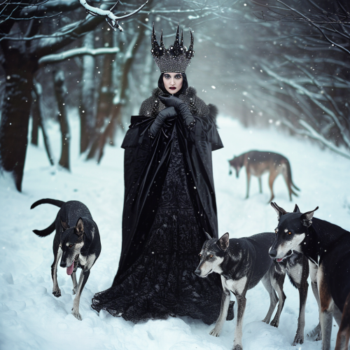 evil villian queen in black crown with Irish Wolfhounds around her in snow--ar 9:16 --style raw --v 6.0 --s 0