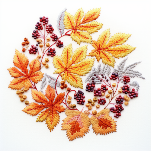 Motifs are autumn leaves. Dot embroidery. White background color. Circular.